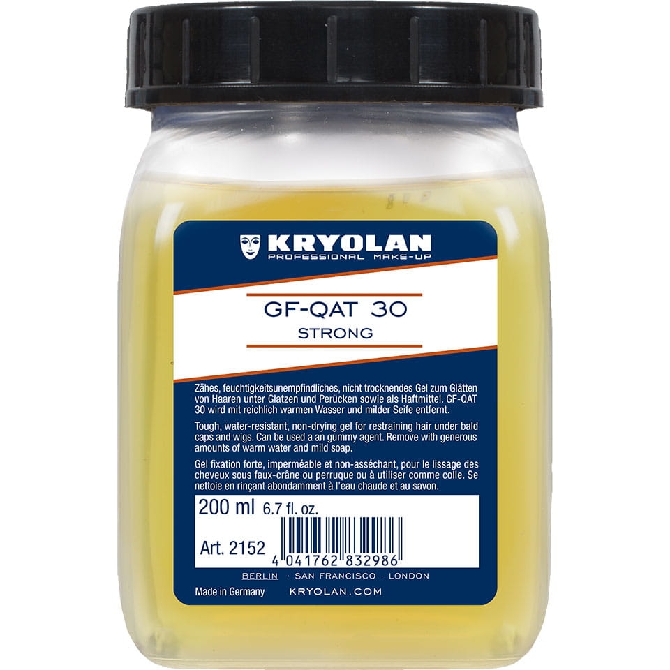 GF-QAT 30 Strong to twardy, wodoodporny, nieschnący żel do włosów pod łysiny i peruki. Może być również stosowany jako klej. Usuń dużą ilością ciepłej wody i łagodnego mydła.