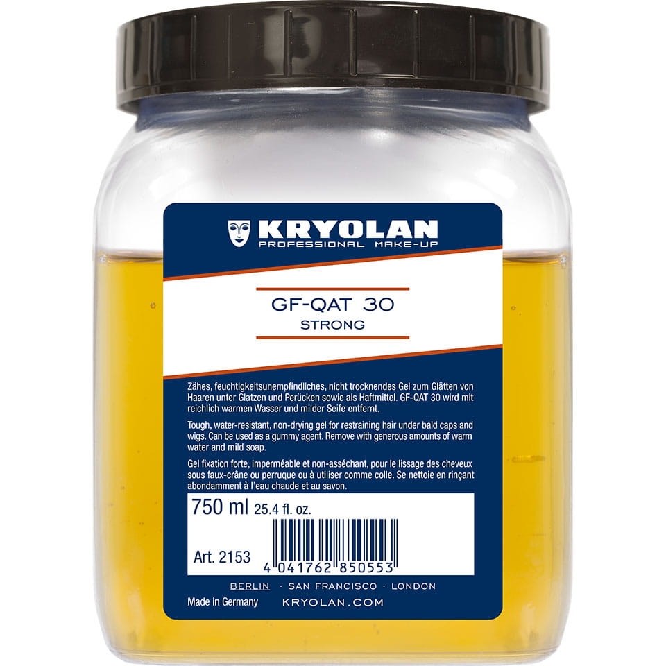 GF-QAT 30 Strong to twardy, wodoodporny, nieschnący żel do włosów pod łysiny i peruki. Może być również stosowany jako klej. Usuń dużą ilością ciepłej wody i łagodnego mydła.