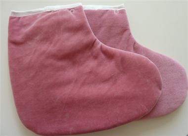 Skarpety do zabiegów parafinowych składają się z podszewki, ociepliny i froty, wykończone taśmą ozdobną. Wymiary to ok 28cm na 32cm, jest to rozmiar uniwersalny. Akcesoria kosmetyczne wykonane są z wysokiej jakości materiału, "frotte strzyżona" o składzie: 77% bawełna i 23% poliester, który posiada szeroką gamę kolorów.
