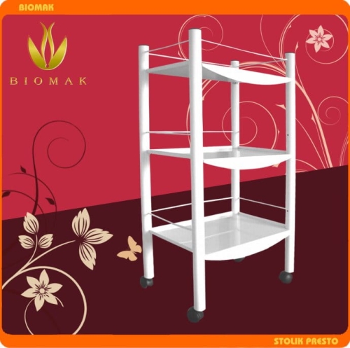- stolik metalowy z 3 półkami zabezpieczonymi przed spadaniem postawionych przedmiotów